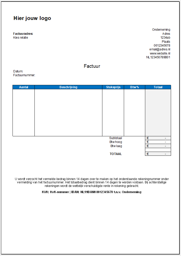 - Zet bovenaan je bedrijfslogo, bedrijfsnaam, adresgegevens, KVK-nummer en btw-identificatienummer toe;